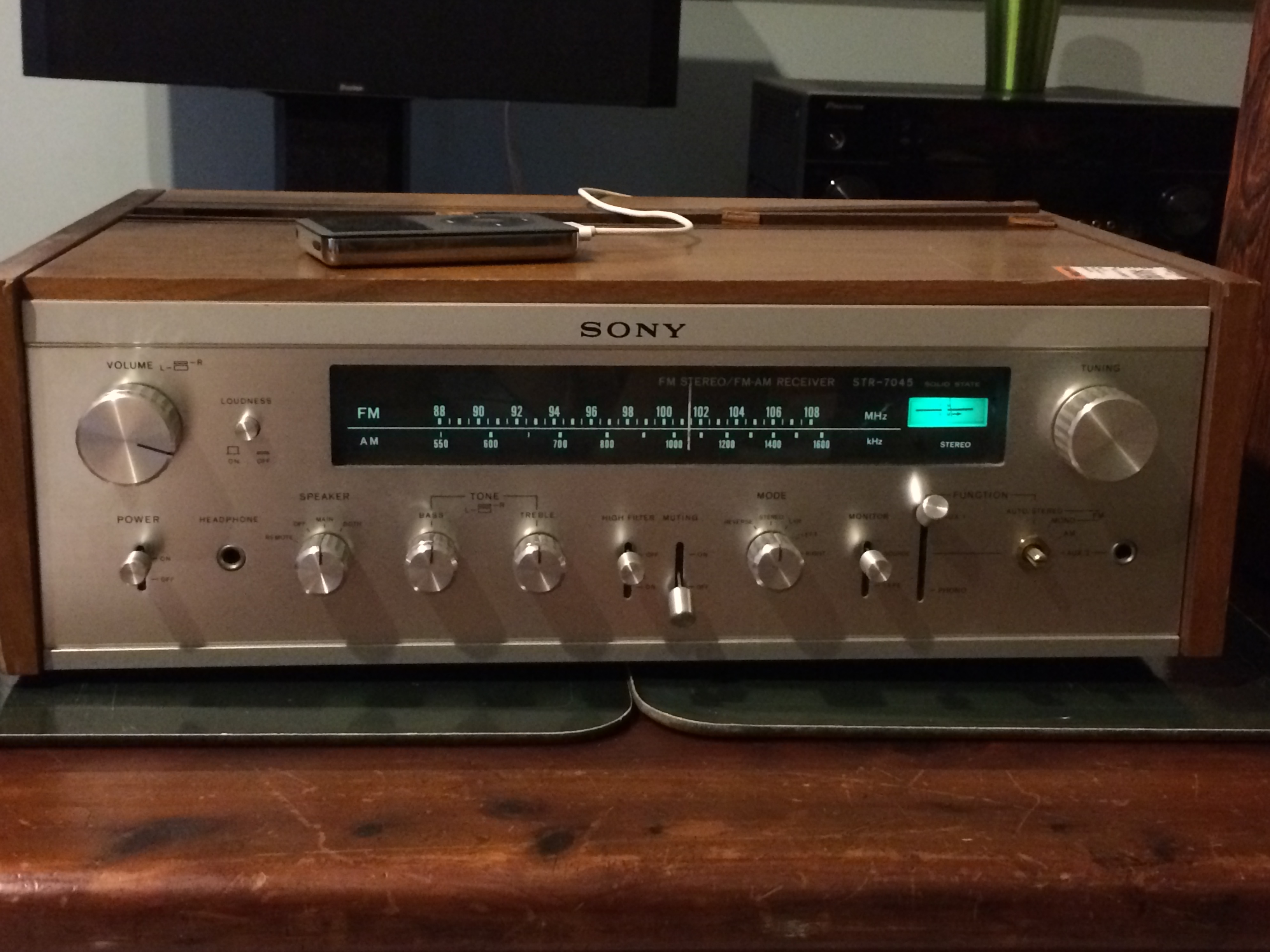 Also in is a Sony STR-7045 receiver. I had the TOTL -7065 a while ago (reviewed somewhere in this blog) so I was definitely excited to see this one. Despite being low on the model range totem pole, this is a heavy and well-built machine- I would say it’s nicer than the equivalent Pioneer SX-737, dunno about Marantz. It plays well too – hooked up to my Polk Monitor 5Bs it sounds pretty nice, and gets loud quick. It deserves a deep cleaning, and the wood case needs some restoration – some of the vent slats are broken loose. This was a problem on my 7065 too. And the function knob is missing – looking for a replacement, but eBay is a little pricey.