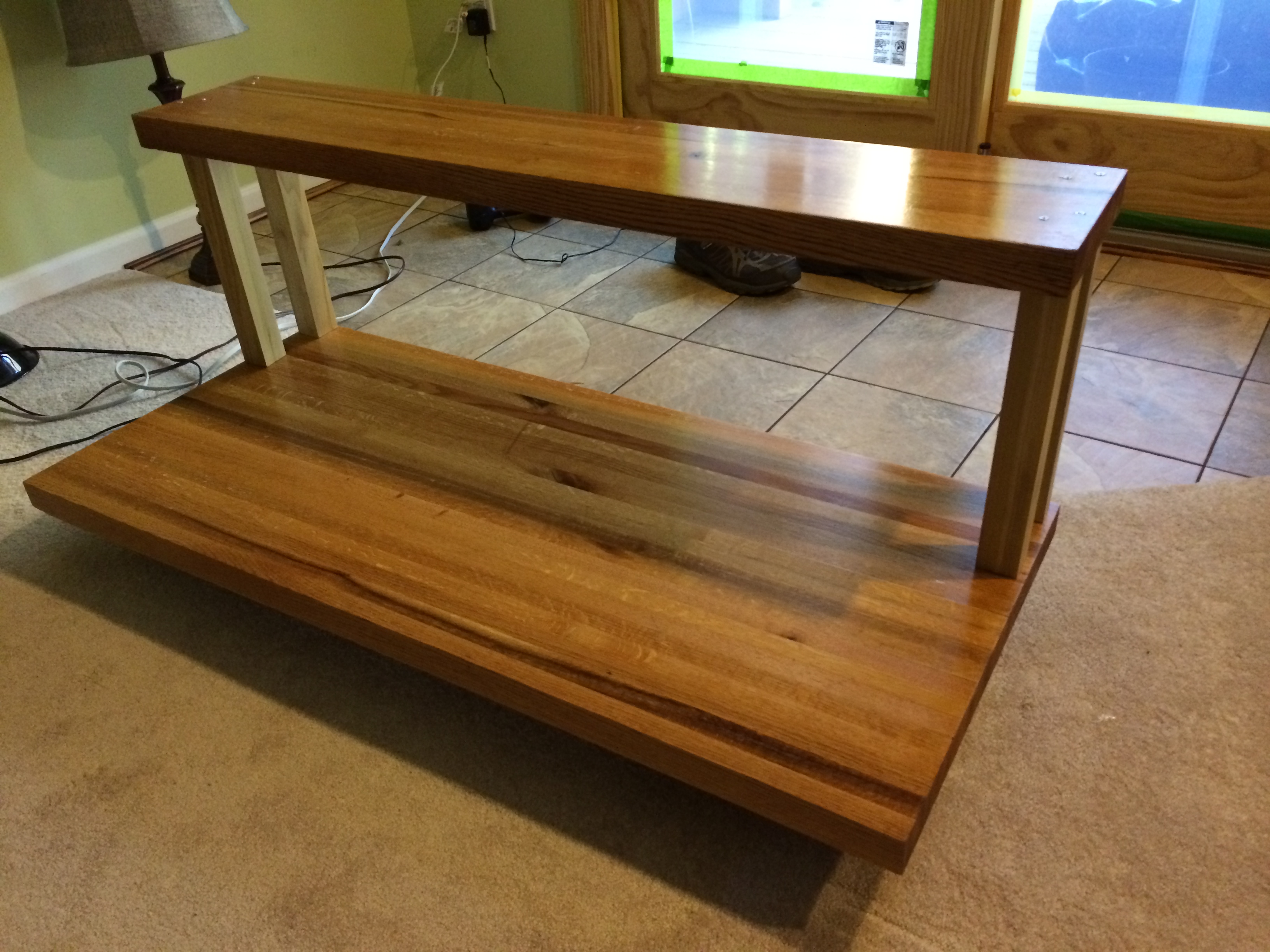 So I got to work. It took about 2 hours of work with an orbital sander to get the surfaces in nice and smooth condition, then I stained and poly’d them to get a nice even finish. I was debating whether to oil or seal them and went with the seal. Looking back, I probably should have oiled them – the stain and poly left some white spots on the finish. Luckily they are all covered with gear now.