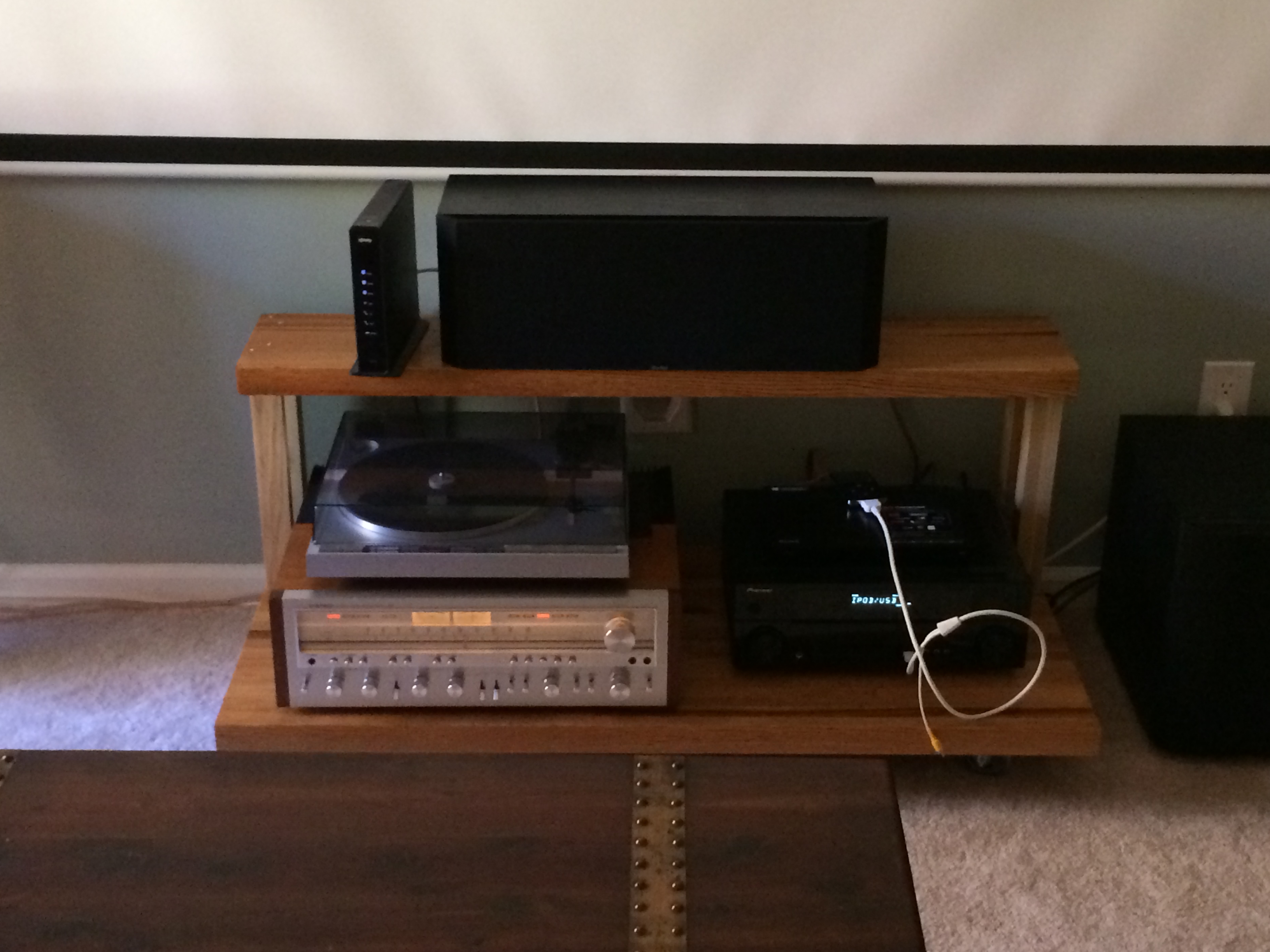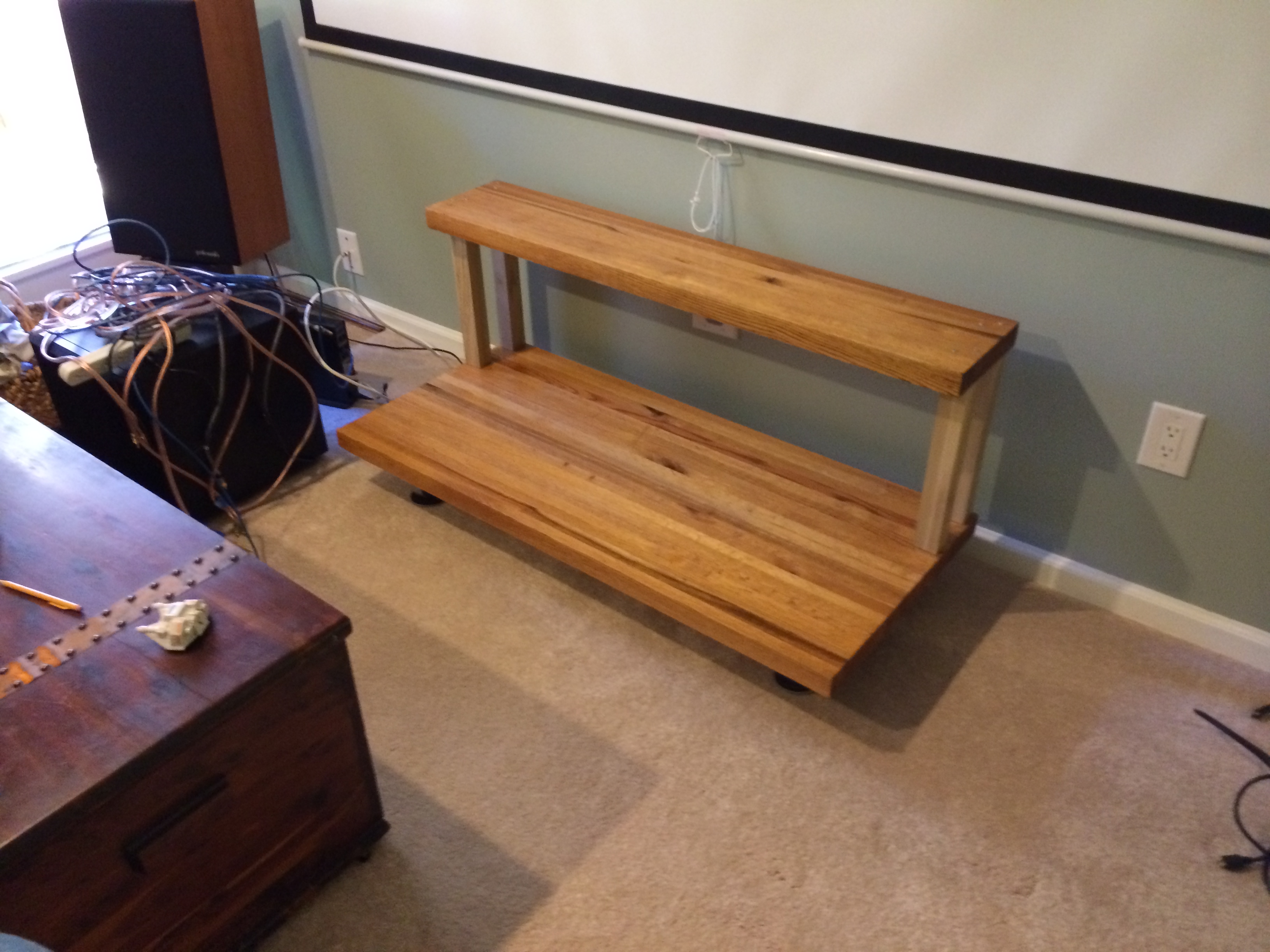 I stained some pine dowels from Home Depot for the uprights and bolted 4 industrial steel castors to the bottom, which look awesome. Now my SX-1250, Yamaha P-500, Pioneer VSX-820 and blu-ray are on the bottom, and my Boston VR12 is up on top under the projection screen.